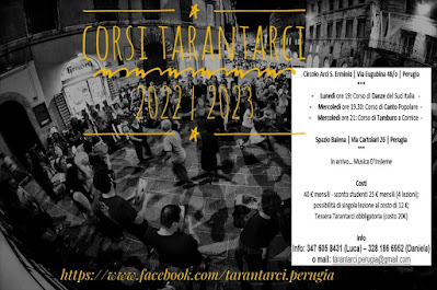 Dopo la presentazione dei corsi, offriremo un piccolo aperitivo con vino e pizza (ricordatevi di portare gli ecobicchieri), fateci sapere tramite mail (tarantarci.perugia@gmail.com) se parteciperete.